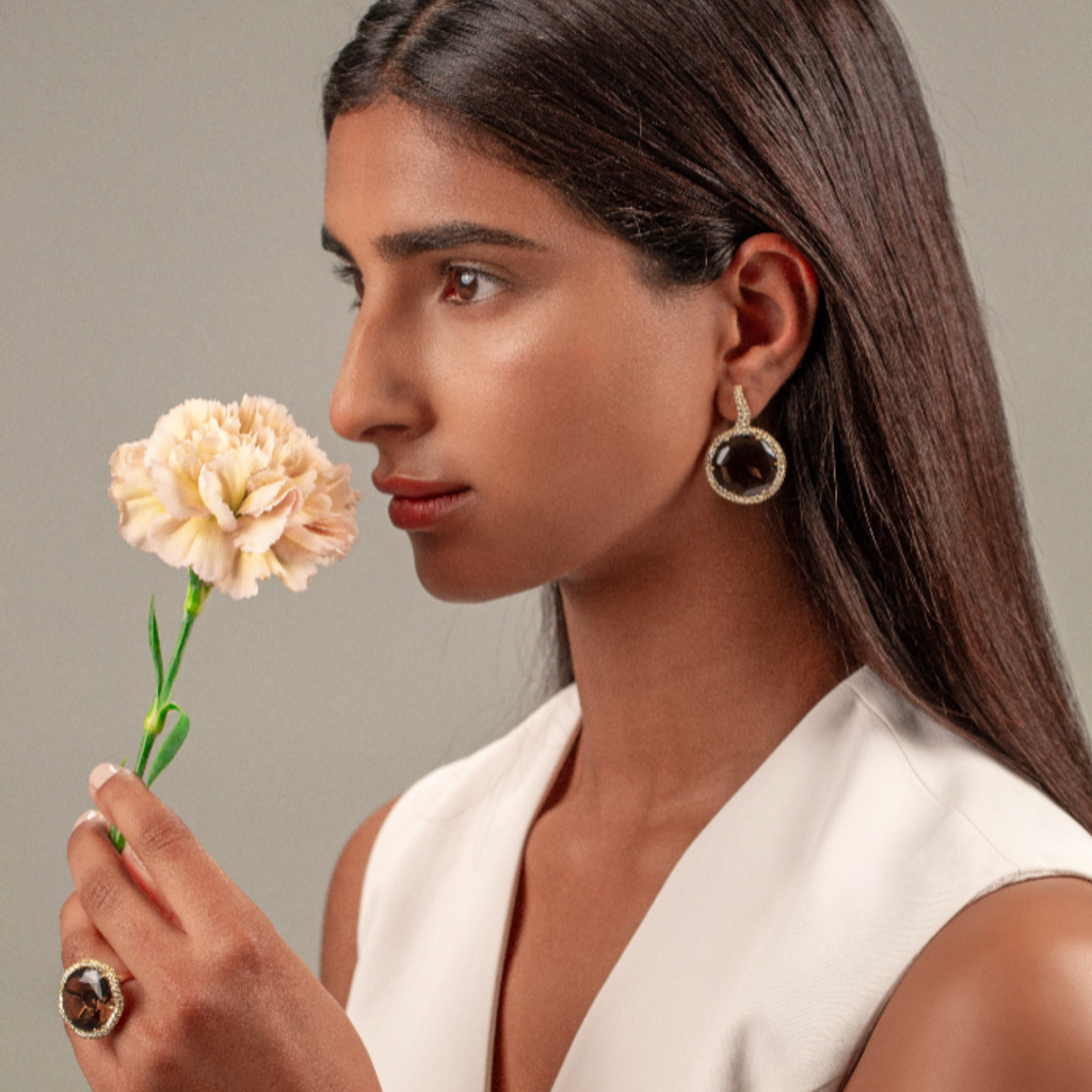 The Smoky Topaz Ring is a bold and sophisticated statement from the One-of-a-Kind collection. Featuring a richly faceted smoky topaz at its center, surrounded by a halo of pavé diamonds, it creates a stunning contrast of warmth and brilliance. With its striking design and luxurious presence, this ring embodies elegance and individuality, making it a timeless addition to any collection.
