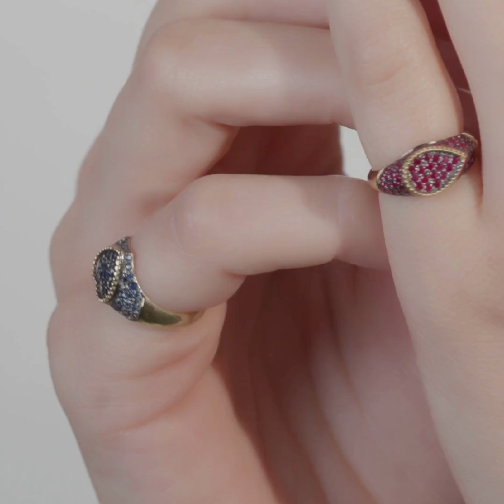 The Ruby Petal Ring is designed for the pinky finger, featuring a single petal silhouette pavé‑set in radiant rubies, with additional stones flowing partway along the band. The rich red hue stands out against warm blackened gold tones, creating a bold yet graceful piece that brings depth and color to any look.