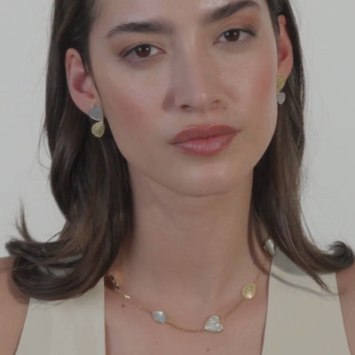 The Pulse & Petal Necklace is a poetic interplay of texture and color. Heart and petal motifs dance together, touched with the sparkle of diamonds and the gentle vibrance of turquoise. A necklace that speaks of elegance and soul, it lends depth and meaning to your collection. Also available in mother of pearl.